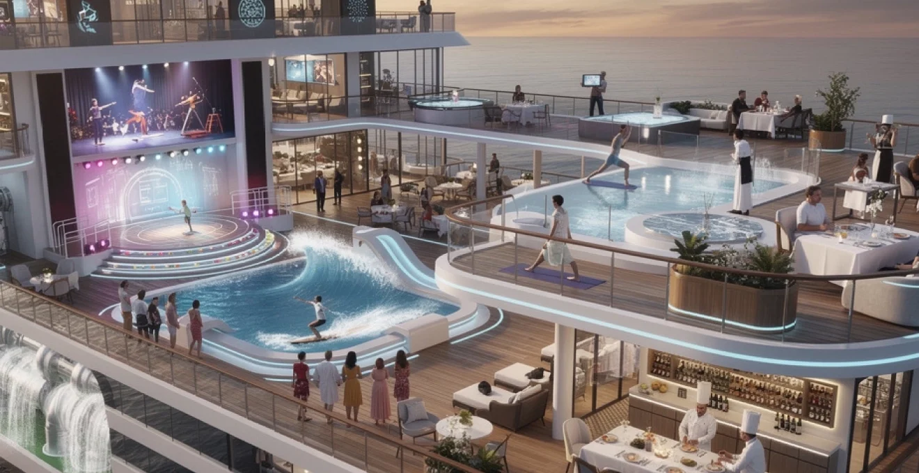Les infrastructures de loisirs embarquées rivalisent désormais avec les parcs d’attractions terrestres. Les théâtres rotatifs de 360 degrés offrent une expérience immersive unique, tandis que les simulateurs FlowRider permettent de pratiquer le surf en haute mer grâce à des jets d’eau propulsés à 50 km/h.